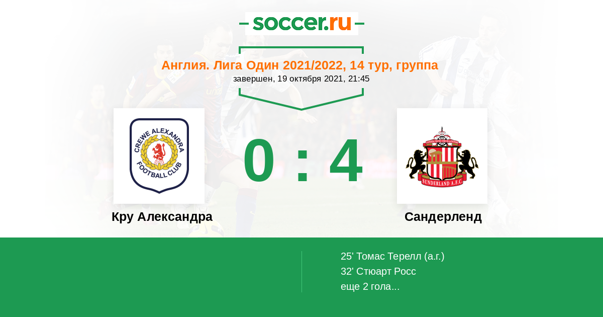 Протокол матча Кру Александра против Сандерленд