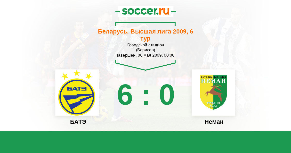 Беларусь. Высшая лига 19.06.2010 Неман Логотип футбольный клуб Неман (Гродно) 0:5 Логотип футбольный клуб БАТЭ (Борисов) БАТЭ