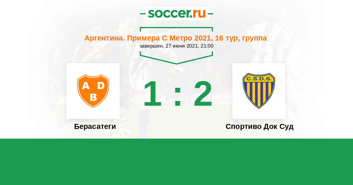 Аргентина. Примера С Метро 24.10.2021 Спортиво Док Суд Логотип футбольный клуб Спортиво Док Суд (Буэнос-Айрес) 1:2 Логотип футбольный клуб Берасатеги (Буэнос-Айрес) Берасатеги