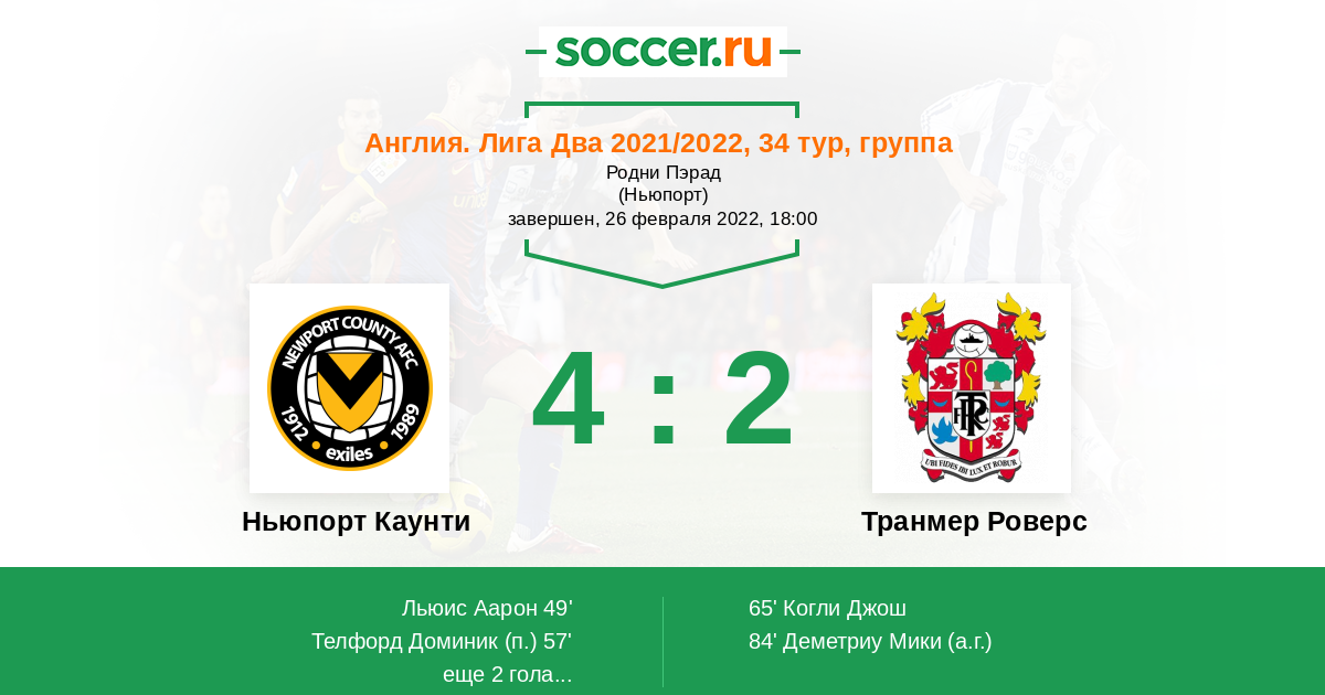 Протокол матча Ньюпорт Каунти против Транмер Роверс