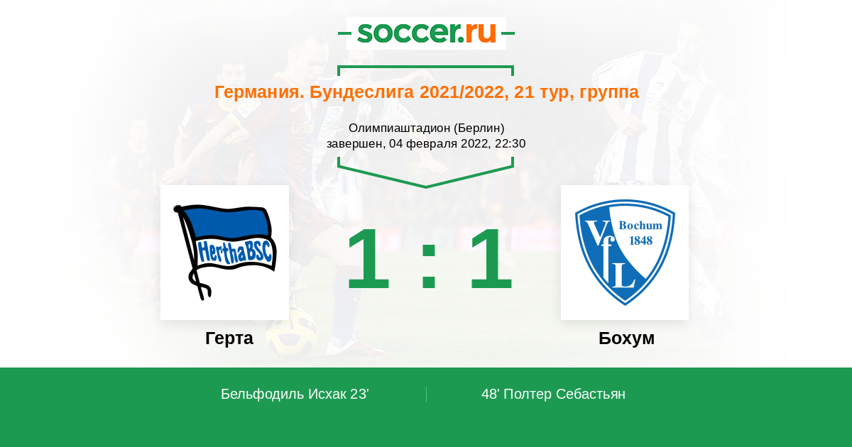 Во время последней паузы на базу берлинского клуба прорвались болельщики, после чего между ними и командой состоялся серьезный разговор. Поклонники “Герты“ требовали улучшения игры и результатов от берлинцев, а также всячески угрожали футболистам. Можно предположить, что данная ситуация должна дать необходимый эффект и заставить “Герту“ выложиться на максимум в предстоящем противостоянии. Кроме того, в последнее время “Старая дама“ успешно действует против “Бохума“ – она победила в первом круге, а также взяла верх в пяти последних официальных матчах против своих визави.
