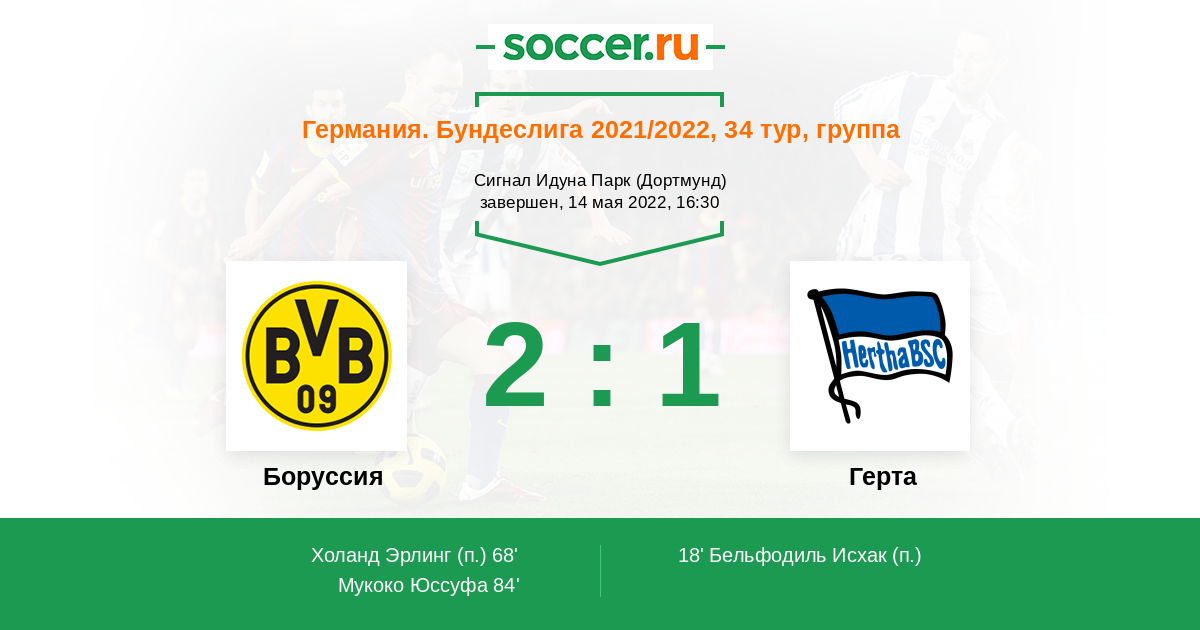 Во-вторых, у них много мотивированных игроков. Эрлинг Холанд официально уходит и точно захочет напоследок забить, а Юлиан Брандт, который уже забил рекордные девять голов для себя, никому в карьере не забивал чаще, чем "Герте". Берлинцы, несомненно, окажут относительно неплохое сопротивление, ведь им в целом хватит и ничьей для безопасности, однако раздобыть и ее они не смогут. Коллектив Марко Розе просто не позволит себе домашнюю ошибку на финише.