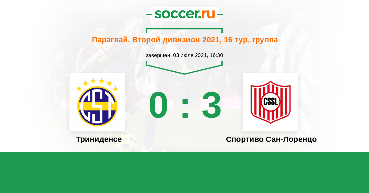 Парагвай. Второй дивизион 22.07.2018 Спортиво Сан-Лоренцо Логотип футбольный клуб Спортиво Сан-Лоренцо 1:1 Логотип футбольный клуб Триниденсе (Асунсьон) Триниденсе