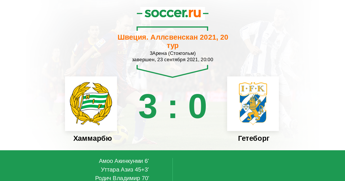 6' (1:0) Амоо Акинкунми (33) (Людвигсон Густав (16))