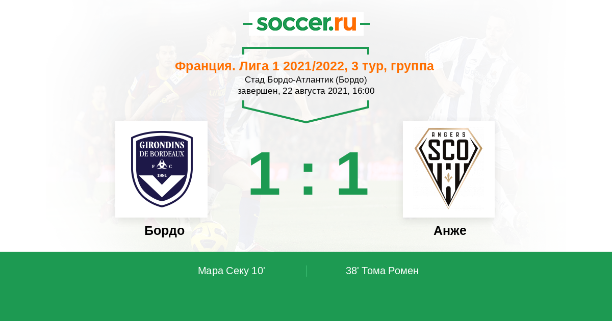 Протокол матча Бордо против Анже