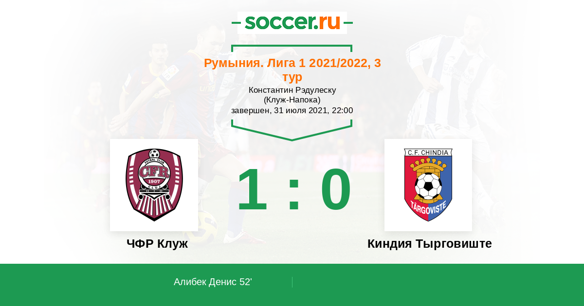 Протокол матча ЧФР Клуж против Киндия Тырговиште