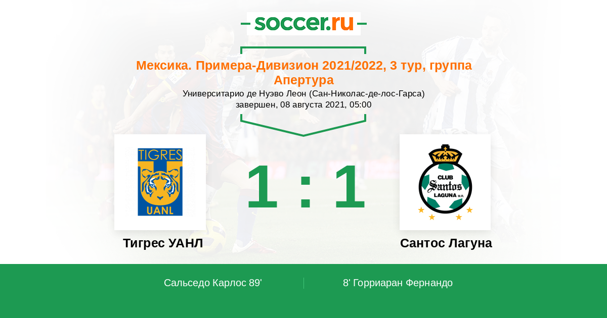 Протокол матча Тигрес УАНЛ против Сантос Лагуна