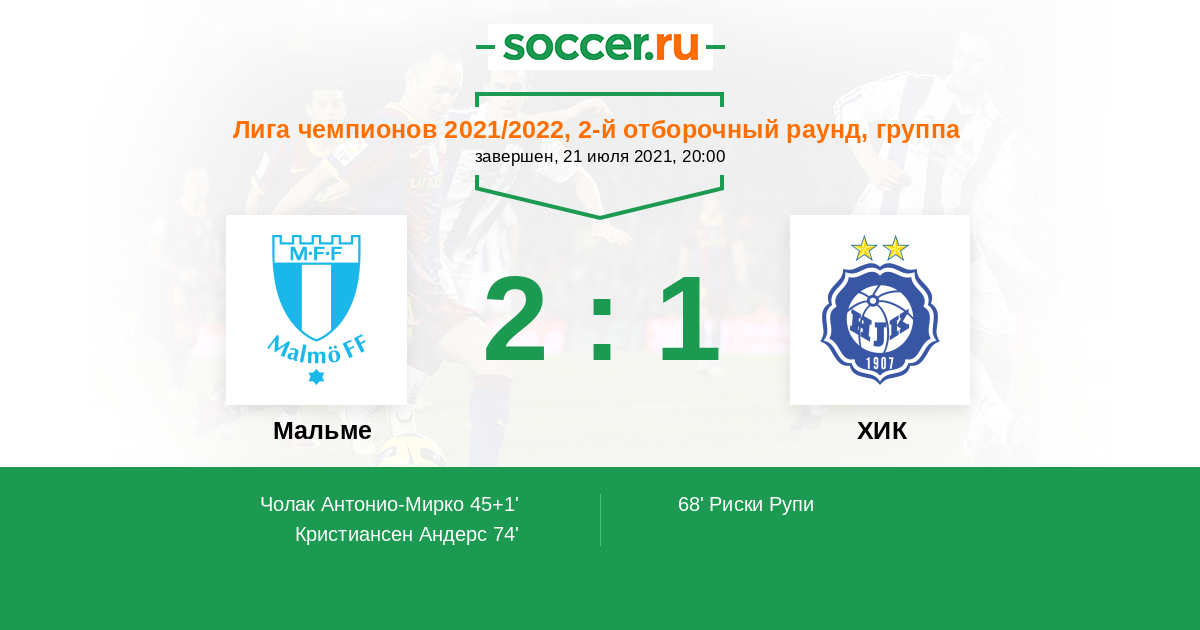 ХИК уверенно прошёл своего первого соперника в квалификации Будучность. Мальме обыграла Ригу скромно победив дома со счётом 1-0 и в гостях сыграла в ничью 1-1, что дала ей возможность пройти в следующий этап. Мальме сейчас лидирует в чемпионате Швеции команда достаточно опытная которая дома должна будет одержать победу. Прогноз, победа Мальме = П.1. Удачи