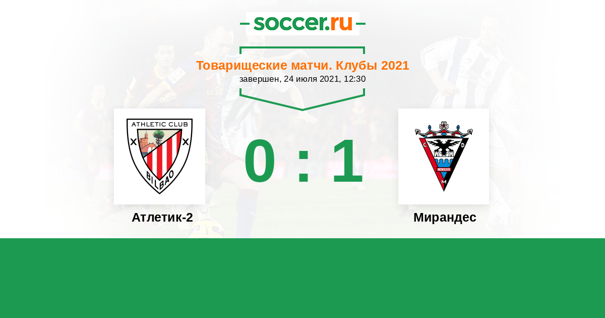 Товарищеские матчи. Клубы 31.07.2024 Атлетик-2 Логотип футбольный клуб Атлетик-2 (Бильбао) 3:0 Логотип футбольный клуб Мирандес (Миранда де Эбро) Мирандес