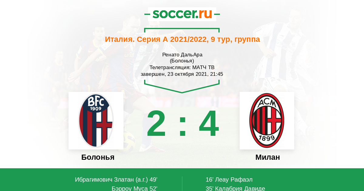 Протокол матча Болонья против Милан