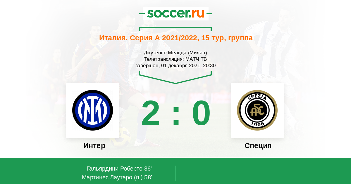 Одна из сильнейших команд чемпионата "Интер" из Милана принимает на своем поле неудачника чемпионата этого розыгрыша - команду "Специя". Вряд ли аутсайдер чемпионата сможет оказать достойное сопротивление сильному "Интеру". Скорей всего миланская команда одержит победу в один-два мяча в этом футбольном матче.