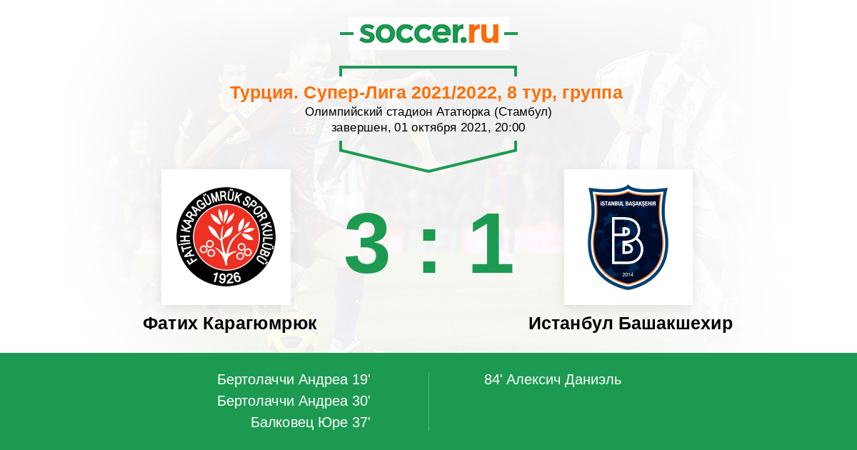 Протокол матча Фатих Карагюмрюк против Истанбул Башакшехир