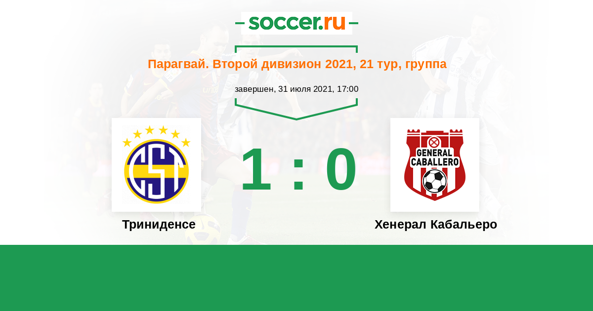 Парагвай. Второй дивизион 09.06.2019 Триниденсе Логотип футбольный клуб Триниденсе (Асунсьон) 1:1 Логотип футбольный клуб Хенерал Кабальеро (Доктор-Хуан-Леон-Майоркин) Хенерал Кабальеро
