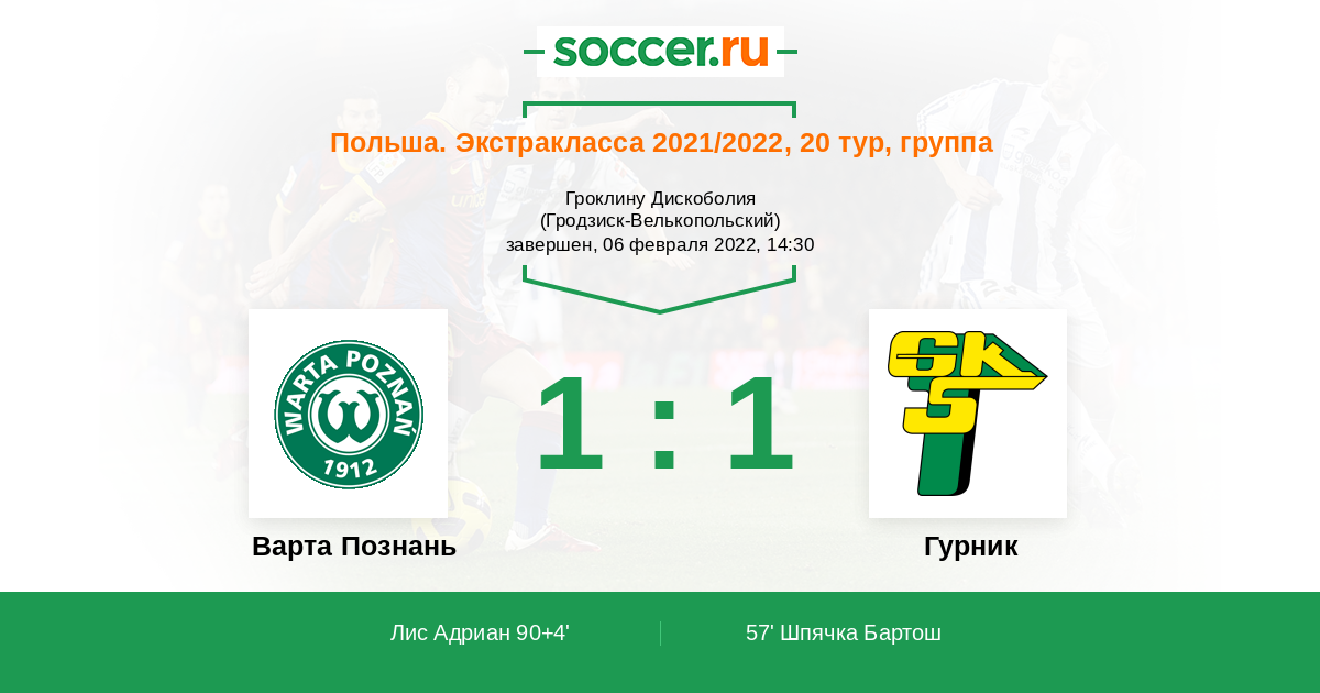 Протокол матча Варта Познань против Гурник