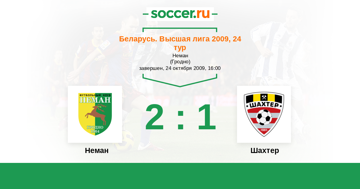 Беларусь. Высшая лига 28.06.2009 Шахтер Логотип футбольный клуб Шахтер (Солигорск) 2:0 Логотип футбольный клуб Неман (Гродно) Неман