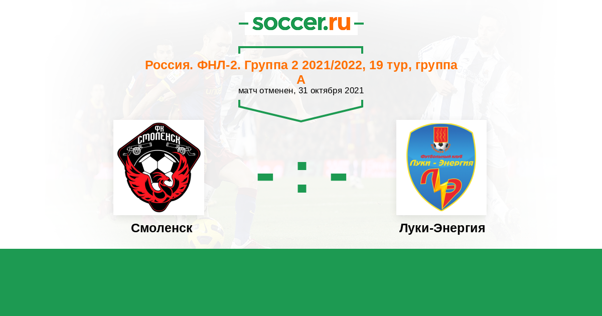 Россия. Вторая лига. Группа 2 07.11.2020 Смоленск Логотип футбольный клуб Смоленск 0:0 Логотип футбольный клуб Луки-Энергия (Великие Луки) Луки-Энергия