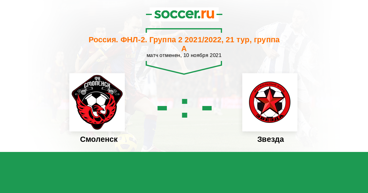 Россия. Вторая лига. Группа 2 10.06.2021 Звезда Логотип футбольный клуб Звезда (Санкт-Петербург) 4:1 Логотип футбольный клуб Смоленск Смоленск