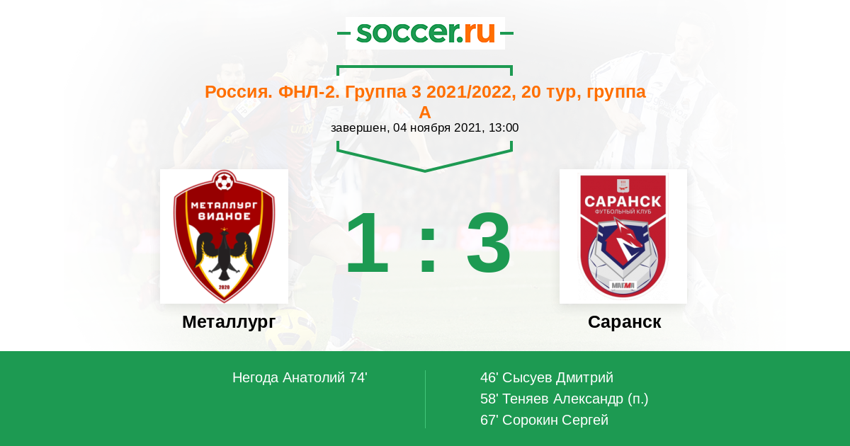 Протокол матча Металлург против Саранск