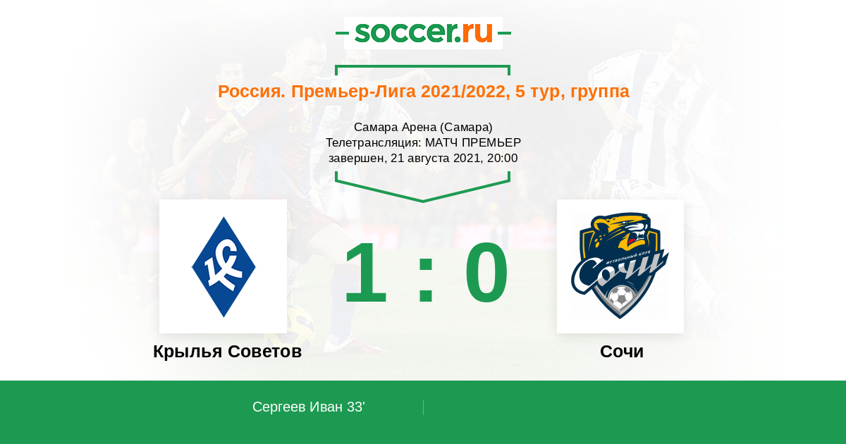 Почему такой прогноз? У Сочи состав, безусловно, посильнее. К тому же они неплохо стартовали в РПЛ. Однако у Крыльев Советов также неплохой коллектив, которому просто где-то не повезло на старте. Мне кажется, что самарцы выйдут предельно настроенные, так как уже пора побеждать, в то время как со стороны южан возможна недооценка соперника.