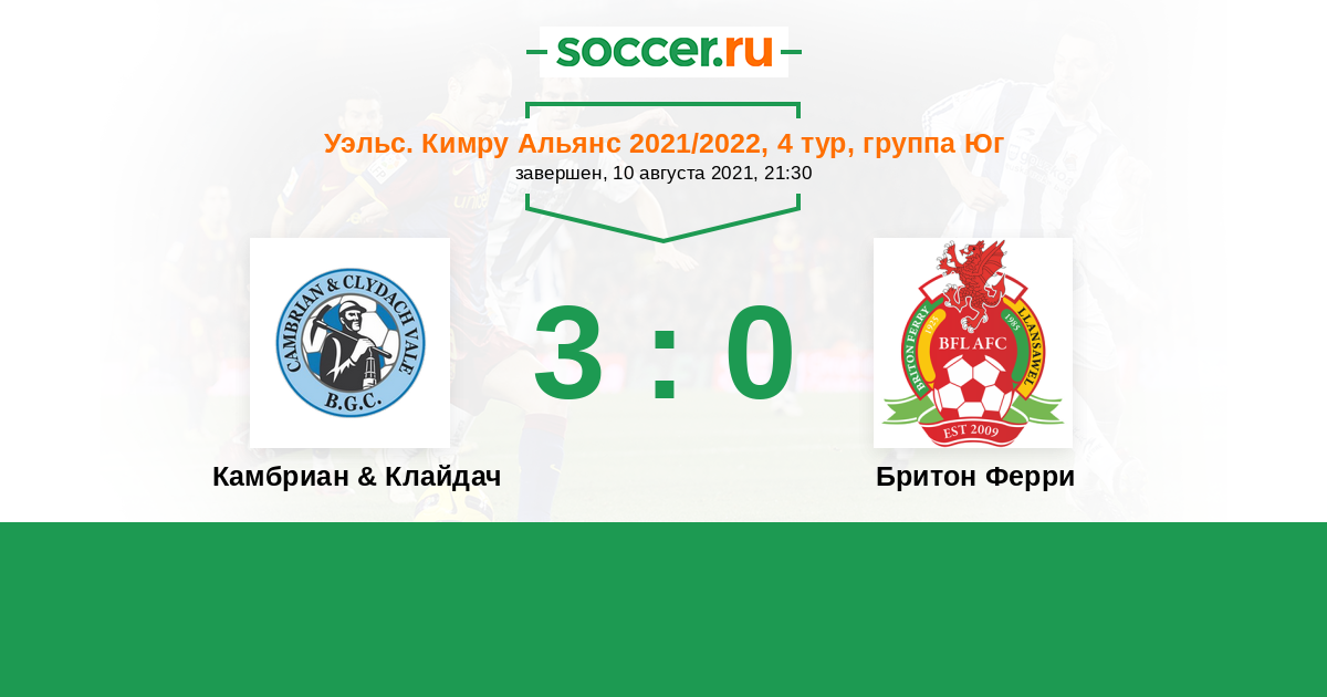 Уэльс. Кимру Альянс 23.09.2017 Камбриан & Клайдач Логотип футбольный клуб Камбриан & Клайдач (Клайдач Вейл) 2:0 Логотип футбольный клуб Бритон Ферри Бритон Ферри