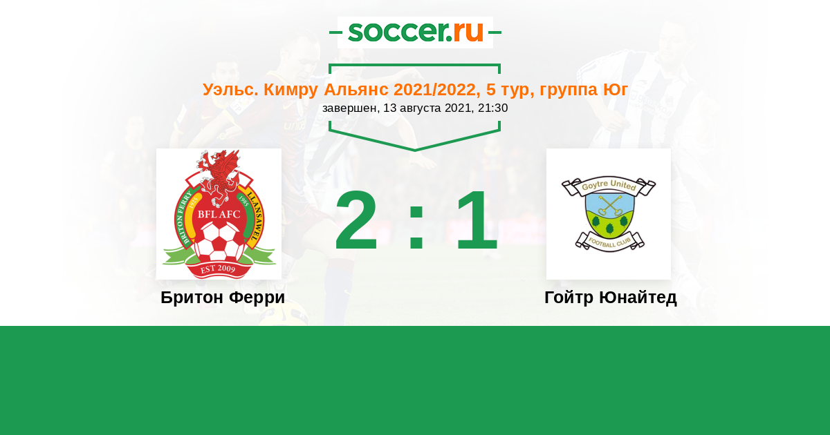 Уэльс. Кимру Альянс 21.09.2018 Бритон Ферри Логотип футбольный клуб Бритон Ферри 1:0 Логотип футбольный клуб Гойтр Юнайтед (Порт-Толбот) Гойтр Юнайтед