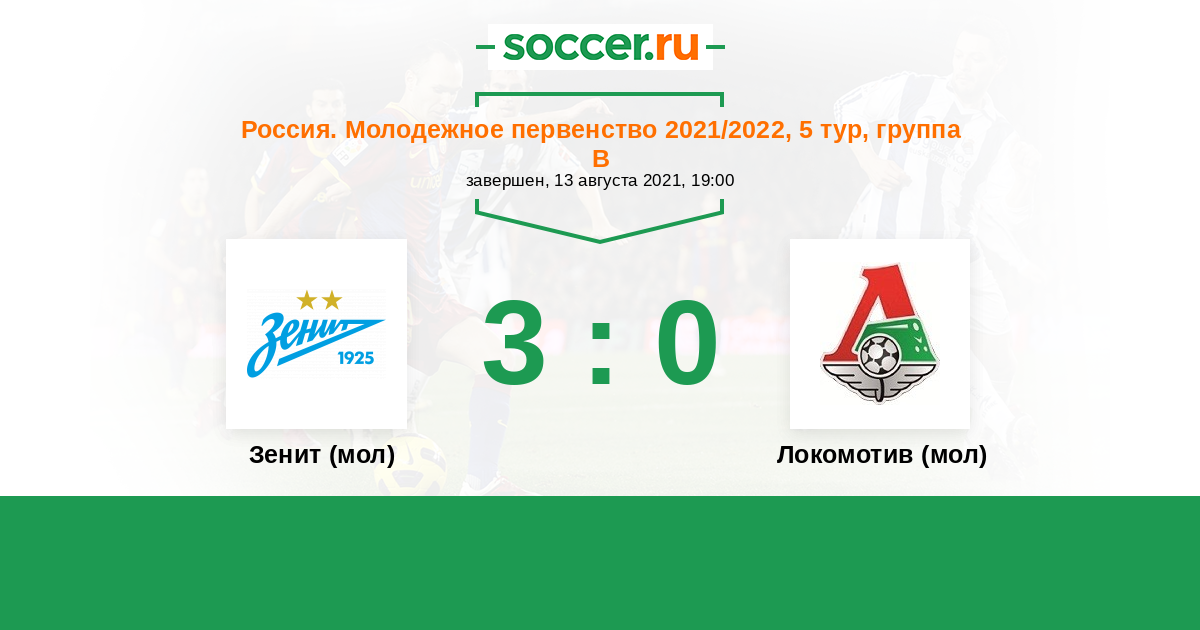 Россия. Премьер-Лига U21 15.10.2021 Локомотив (мол) Логотип футбольный клуб Локомотив (мол) (Москва) 3:0 Логотип футбольный клуб Зенит (мол) (Санкт-Петербург) Зенит (мол)