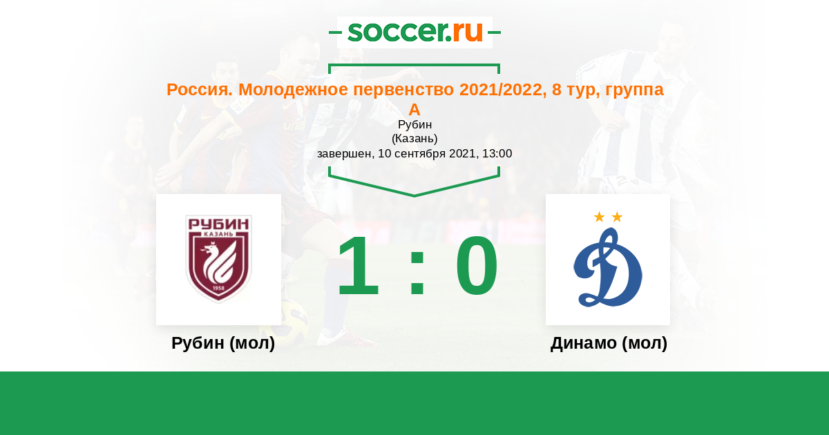 Россия. Премьер-Лига U21 08.11.2019 Рубин (мол) Логотип футбольный клуб Рубин (мол) (Казань) 1:0 Логотип футбольный клуб Динамо (мол) (Москва) Динамо (мол)