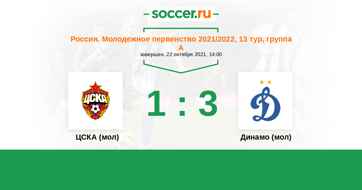 Россия. Премьер-Лига U21 11.04.2013 Динамо (мол) Логотип футбольный клуб Динамо (мол) (Москва) 1:0 Логотип футбольный клуб ЦСКА (мол) (Москва) ЦСКА (мол)
