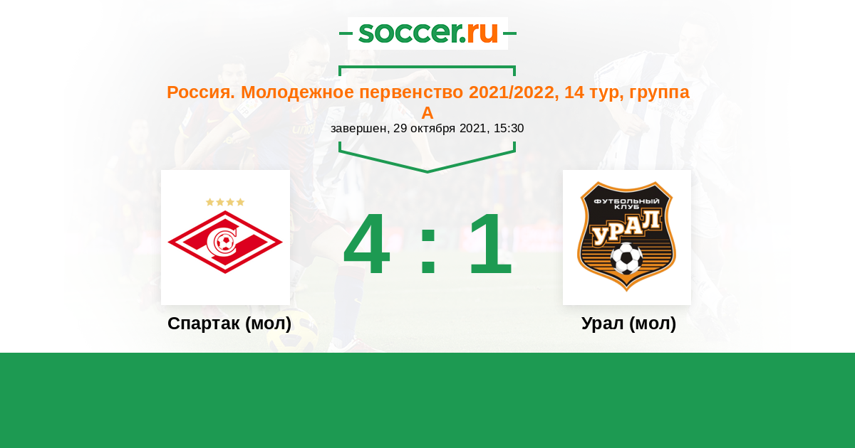 Россия. Премьер-Лига U21 31.10.2015 Спартак (мол) Логотип футбольный клуб Спартак (мол) (Москва) 1:0 Логотип футбольный клуб Урал (мол) (Екатеринбург) Урал (мол)