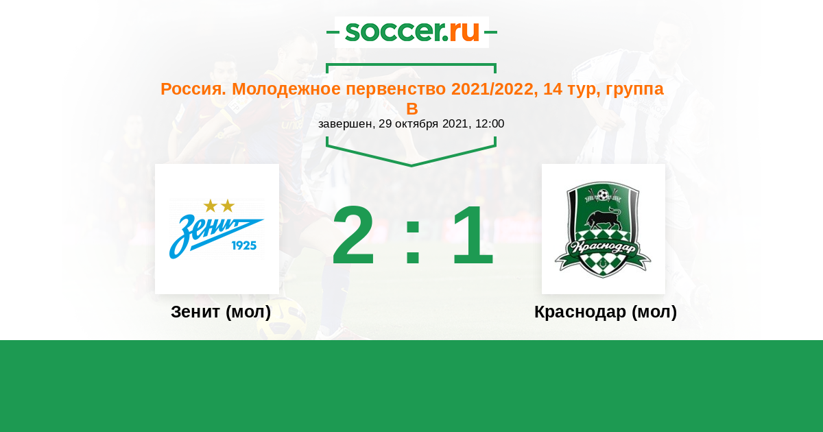 Россия. Премьер-Лига U21 21.04.2021 Краснодар (мол) Логотип футбольный клуб Краснодар (мол) 3:0 Логотип футбольный клуб Зенит (мол) (Санкт-Петербург) Зенит (мол)