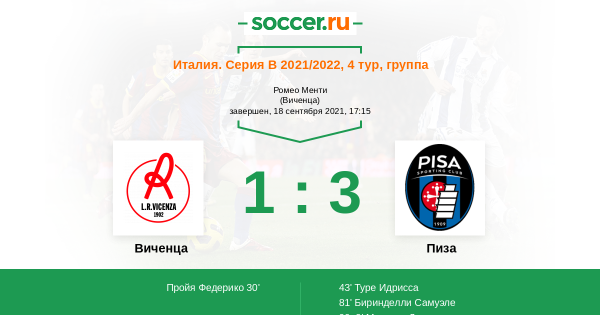 Протокол матча Виченца против Пиза