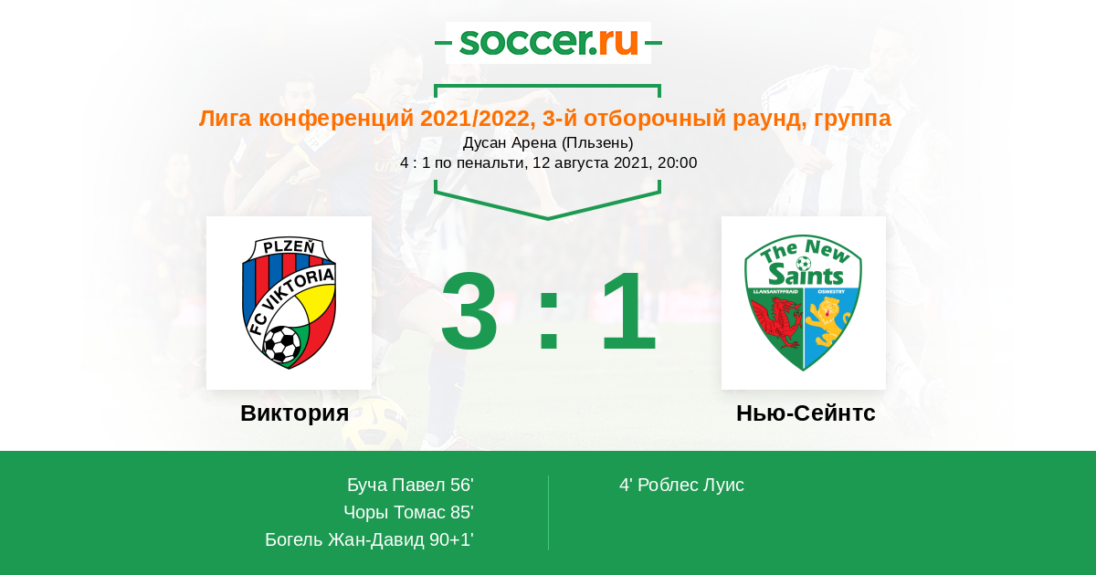 Первый матч неожиданно завершился победой Нью-Сейнтс со счетом 4:2. Но в Чехии все будет по-другому. И надеюсь, что чешская Виктория справится с уэльским клубом и пройдет в следующий раунд. Счет 3:0