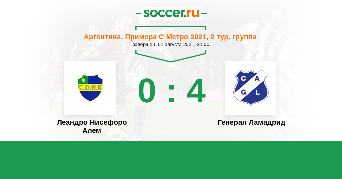 Аргентина. Примера С Метро 15.03.2021 Генерал Ламадрид Логотип Генерал Ламадрид (Буэнос-Айрес) 0:0 Логотип футбольный клуб Леандро Нисефоро Алем (Буэнос-Айрес) Леандро Нисефоро Алем