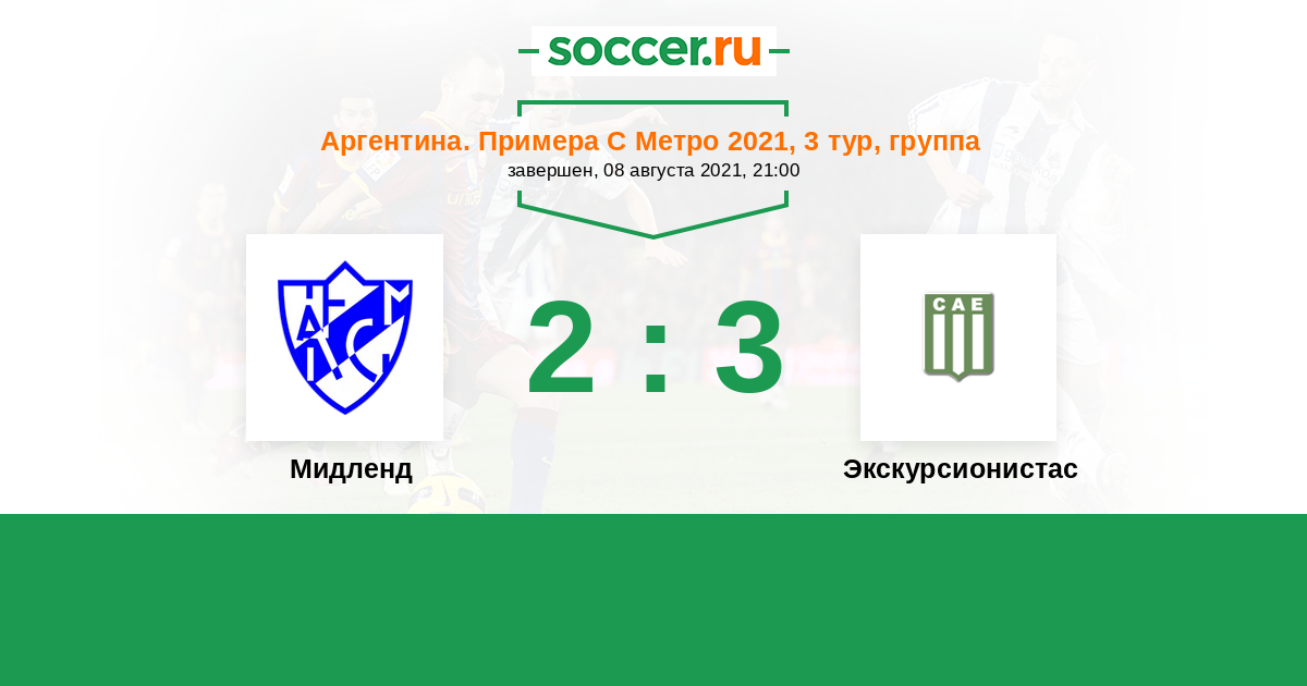Аргентина. Примера С Метро 26.08.2018 Мидленд Логотип футбольный клуб Мидленд (Либертад) 2:1 Логотип футбольный клуб Экскурсионистас (Буэнос-Айрес) Экскурсионистас