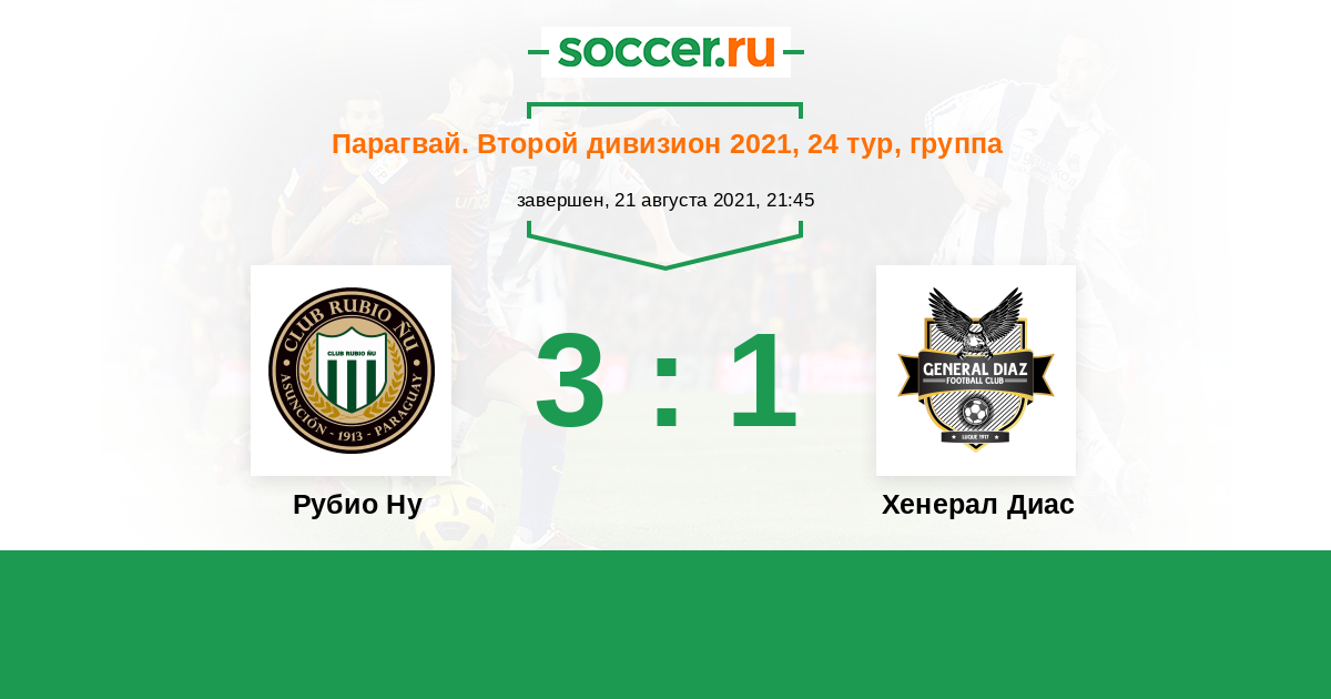 Парагвай. Второй дивизион 15.05.2021 Хенерал Диас Логотип футбольный клуб Хенерал Диас (Луке) 1:0 Логотип футбольный клуб Рубио Ну (Асунсьон) Рубио Ну