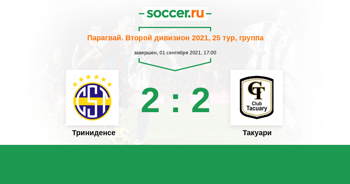 Парагвай. Второй дивизион 22.05.2021 Такуари Логотип футбольный клуб Такуари (Асунсьон) 2:1 Логотип футбольный клуб Триниденсе (Асунсьон) Триниденсе