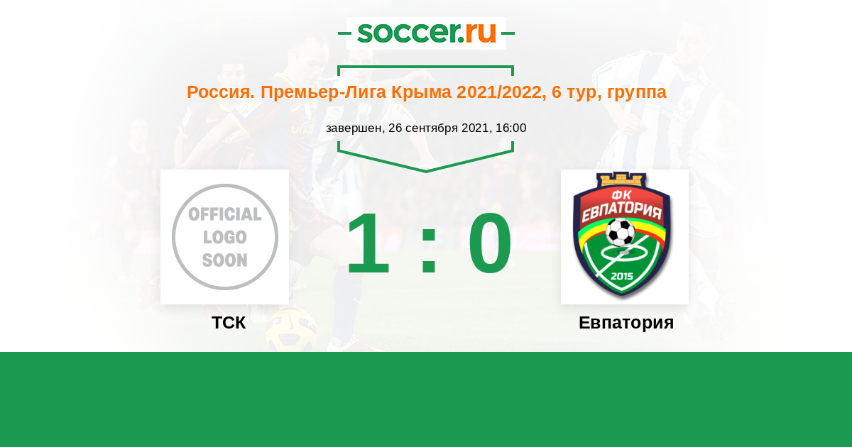 Россия. Премьер-Лига Крыма 15.09.2018 Евпатория Логотип футбольный клуб Евпатория 1:3 Логотип футбольный клуб ТСК (Симферополь) ТСК
