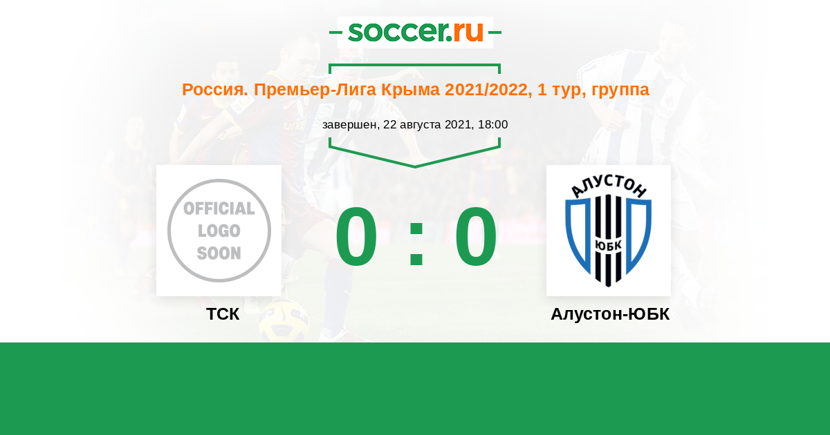 Россия. Премьер-Лига Крыма 27.04.2022 Алустон-ЮБК Логотип футбольный клуб Алустон-ЮБК (Алушта) 0:3 Логотип футбольный клуб ТСК (Симферополь) ТСК
