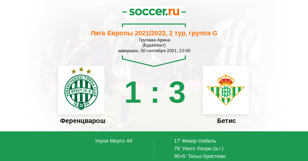 Протокол матча Ференцварош против Бетис