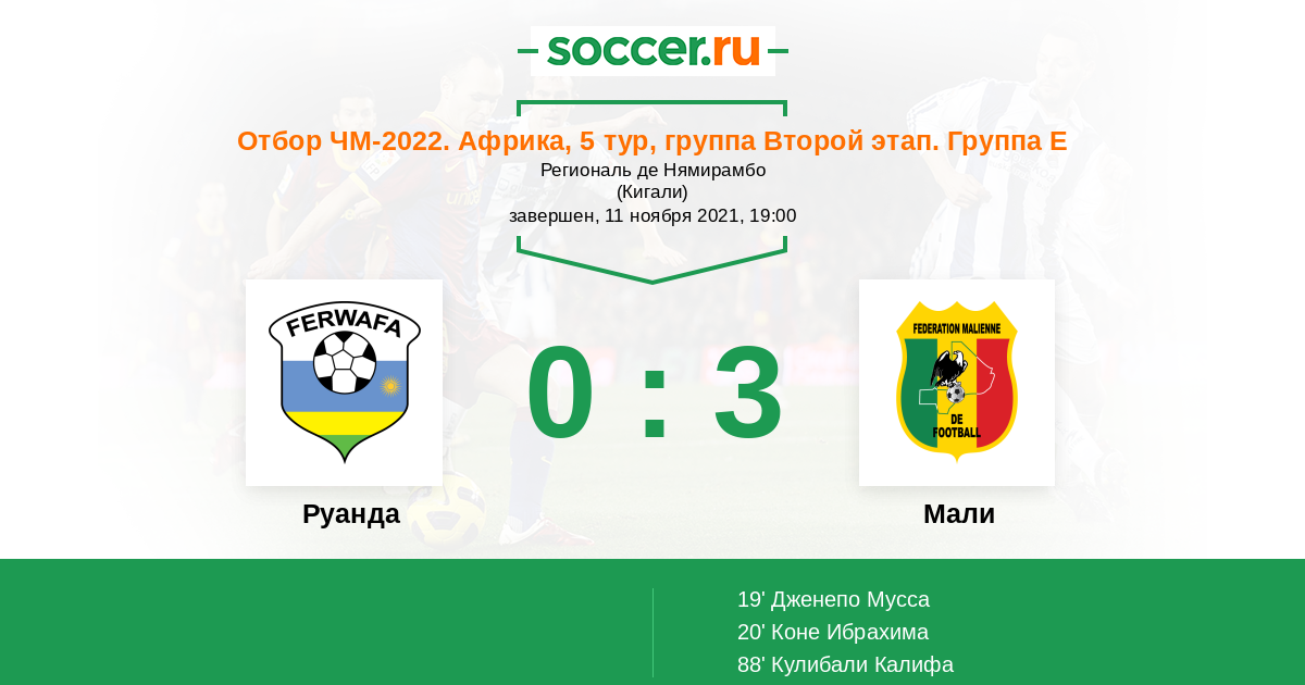 В этой игре всё должно решить мотивация: сборная Мали, что бы пройти дальше, должна побеждать аутсайдера. Руанда будет сопротивляться, шанс уйти с последнего места есть, но общий более высокий уровень сборной Мали должен сказаться.