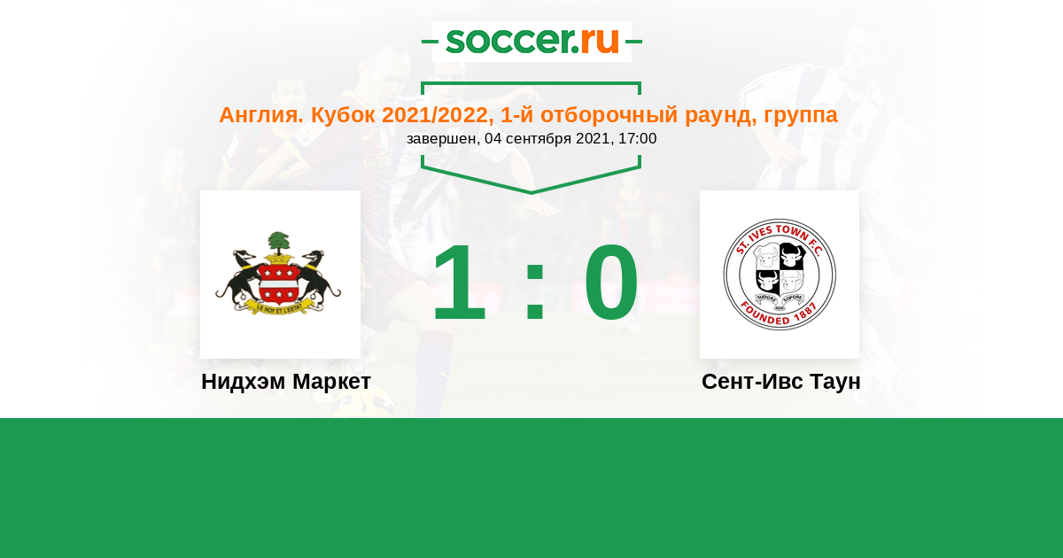 Англия. Истмийский дивизион 17.08.2021 Нидхэм Маркет Логотип футбольный клуб Нидхэм Маркет 1:1 Логотип футбольный клуб Сент-Ивс Таун Сент-Ивс Таун