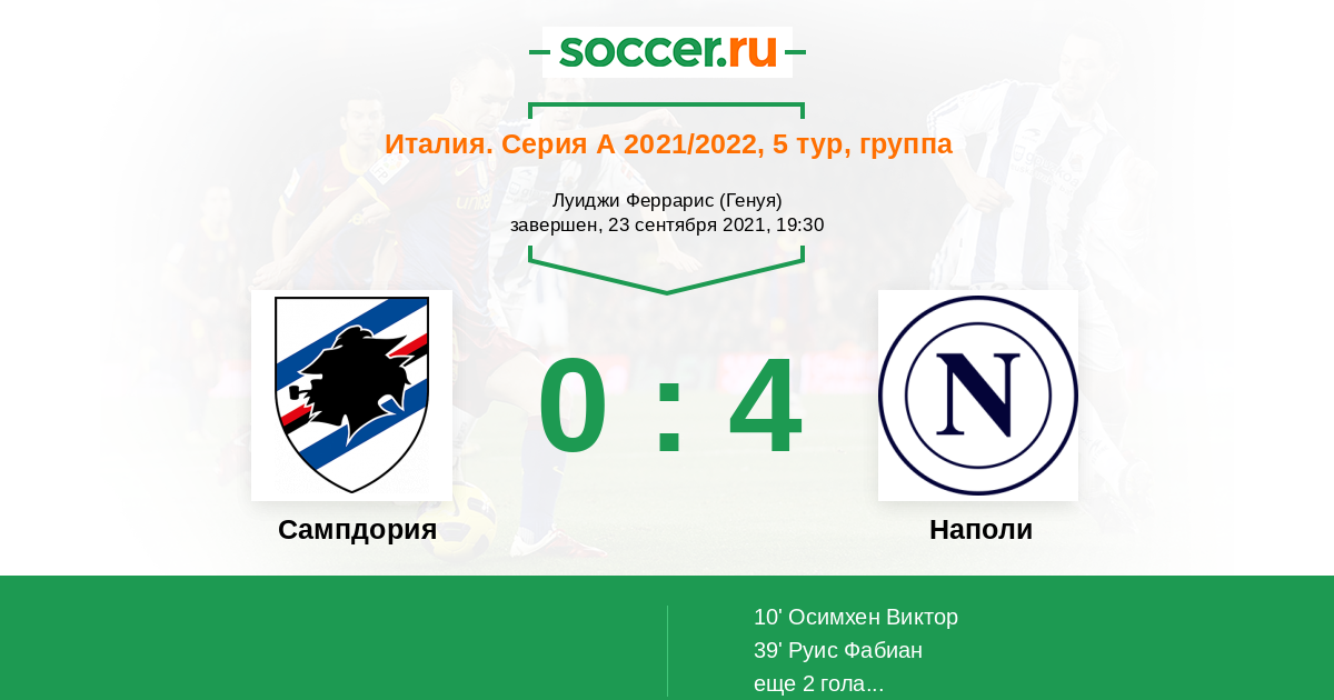 В первую очередь хочется отметить, что это противостояние должно быть очень интересным. Я всё же надеюсь что команда гостей Наполи является фаворитом в этом матче. Уж очень красивую и интересную игру показывают Наполи в начале сезона. И думаю всё таки переиграют хозяев ,команду Сампдорию .