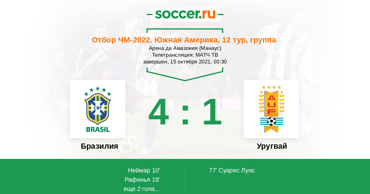 Сборная Уругвая выступает очень нестабильно и испытывает серьёзные проблемы с игрой в нападении: два подряд матча без голов пришлись как раз на возвращение Суареса и Кавани, у которых мало что получается. А в игре с Аргентиной поплыла и оборона уругвайцев, не помогла даже пятёрка защитников: банда Табареса пропустила три и проиграла с сухим счётов, возможно сказалась травма Хосе Хименеса. В нападении Уругвай очень неубедителен, а вот Бразилия в четырёх домашних матчах отбора ни разу не пропустила, к тому же в 21-м веке уругвайцы пока что ни разу не смогли обыграть бразильцев на их поле