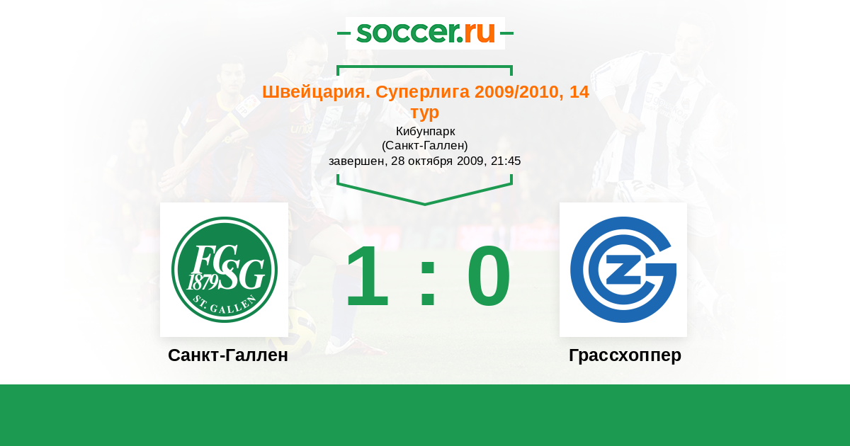 Швейцария. Суперлига 18.04.2010 Санкт-Галлен Логотип футбольный клуб Санкт-Галлен 0:1 Логотип футбольный клуб Грассхоппер (Цюрих) Грассхоппер