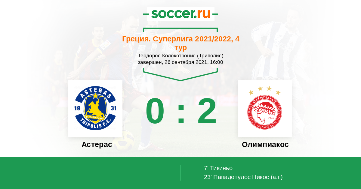 Астерас не забивает совсем, поэтому слабо верится, что забьют Олимпиакоса. Их Надежда на хорошую оборону: стать стеной у ворот и надеяться на счёт ноль-ноль. Думается, что Олимпиакос всё же сможет забить хотя бы один мяч.