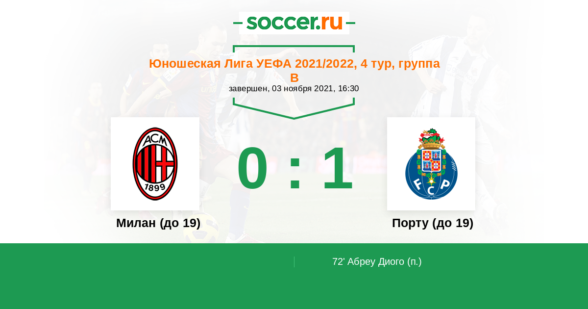 Протокол матча Милан (до 19) против Порту (до 19)