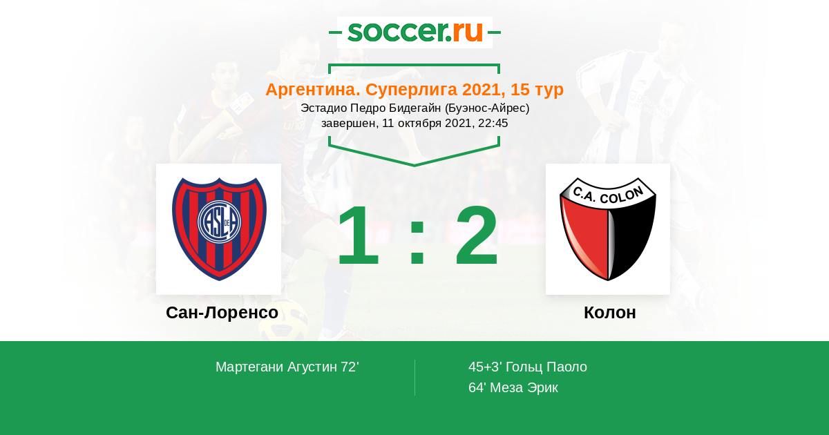 72' (1:2) Мартегани Агустин (42) (Флорес Алексис (32))