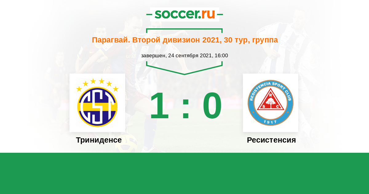 Парагвай. Второй дивизион 18.06.2021 Ресистенсия Логотип футбольный клуб Ресистенсия (Асунсьон) 2:1 Логотип футбольный клуб Триниденсе (Асунсьон) Триниденсе