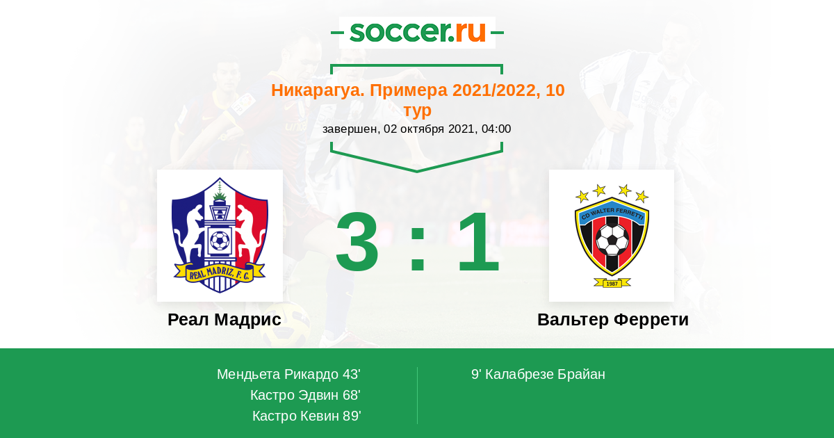 Протокол матча Реал Мадрис против Вальтер Феррети