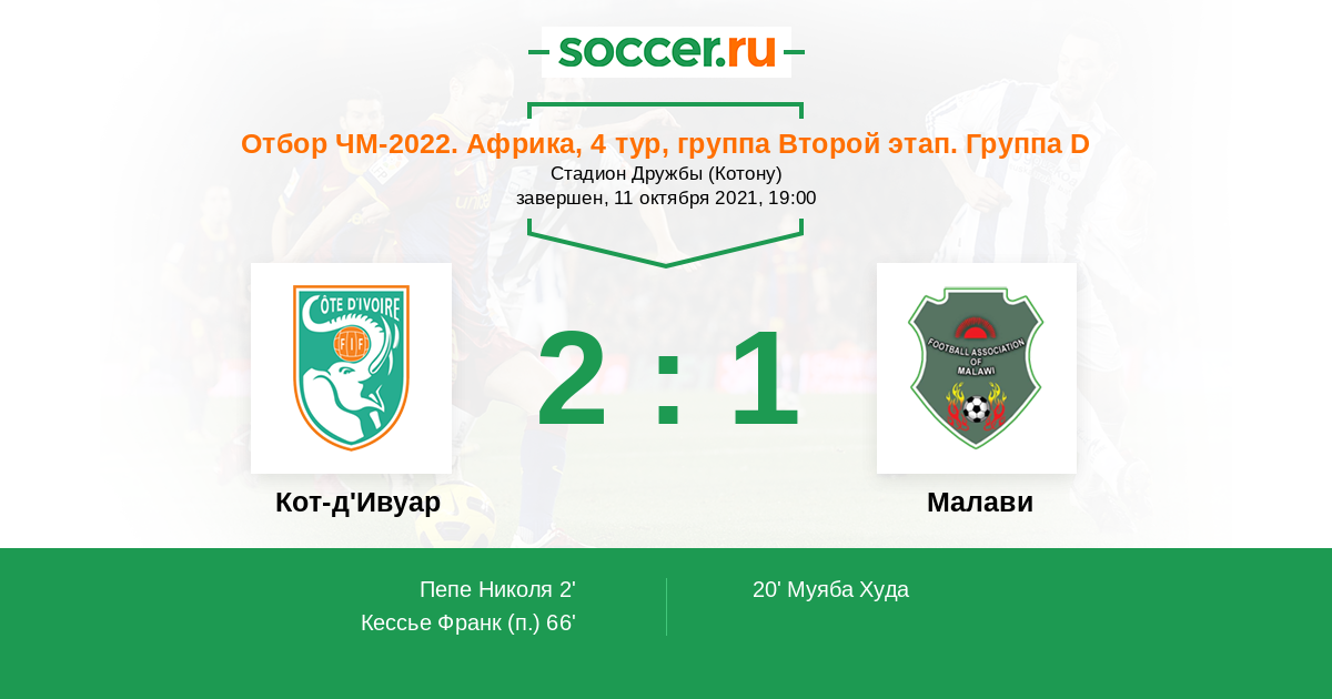 Сборная Кот-д'Ивуара набрала ход, ничья в первом туре с аутсайдером забыта, но еще может неприятно аукнуться в концовке турнира. Сборная Малави была разгромлена на их поле, поэтому дома проблем возникнуть не должно.